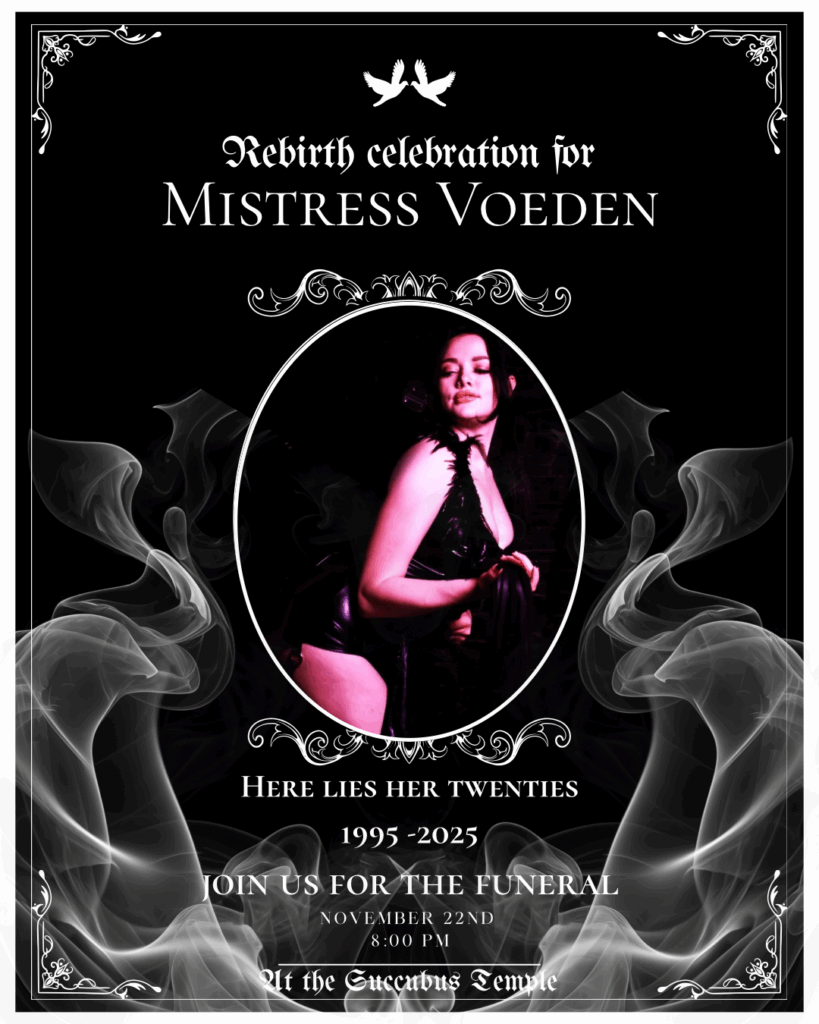 Semi private party celebrating our resident Domme Mistress Voeden. Inquire to attend to receive an invitation.
